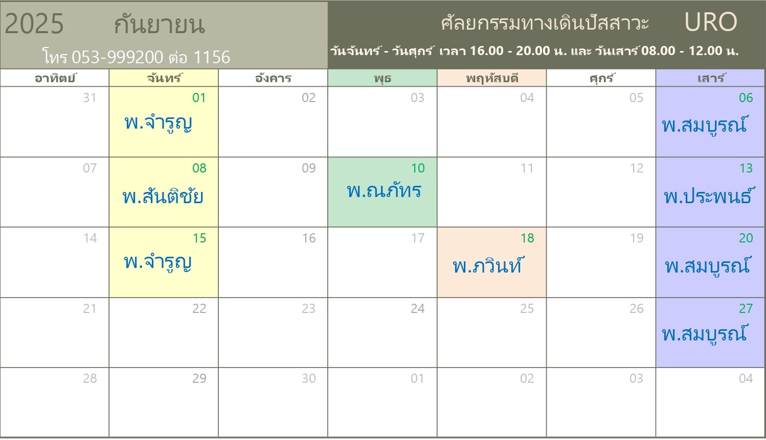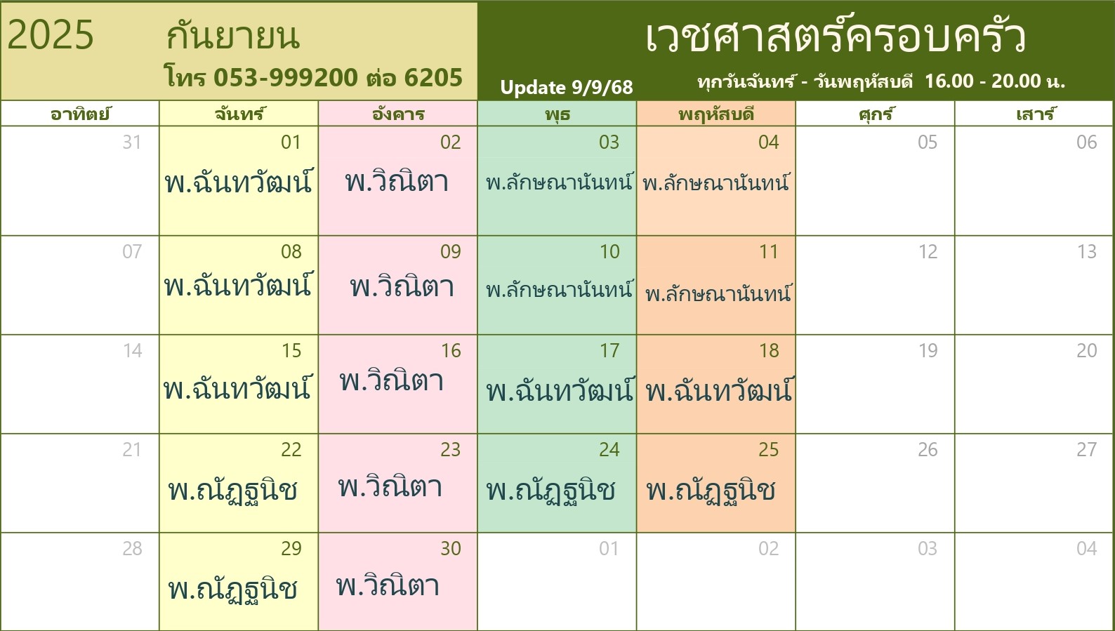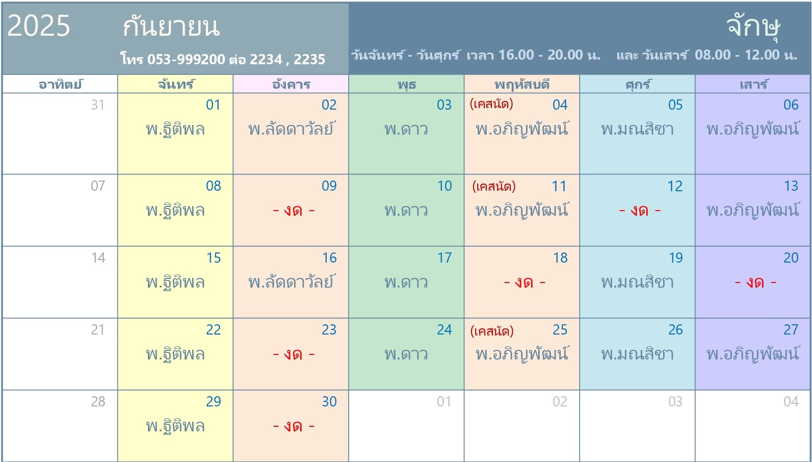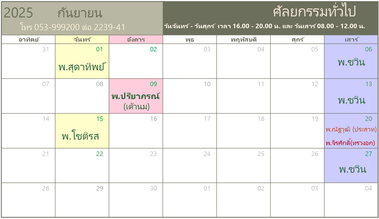 พฤหัสบดี (2,4) | นพ.ขุนเขา ฤกษ์วรชัย | วว.กุมารเวชศาสตร์ , วว.กุมารเวชศาสตร์โรคระบบการหายใจ |