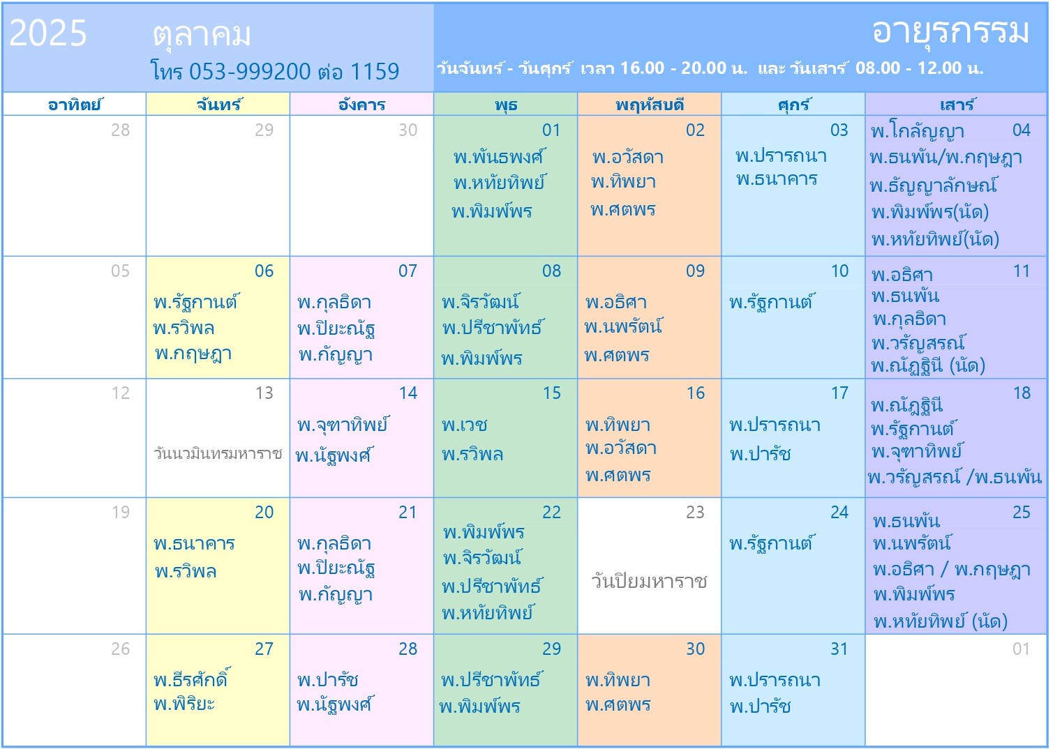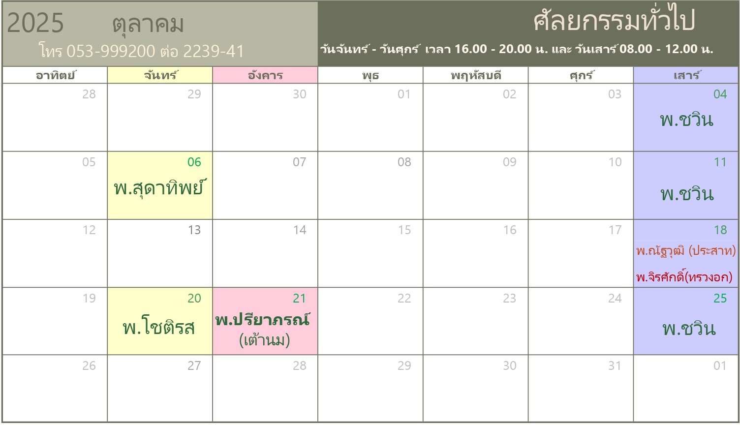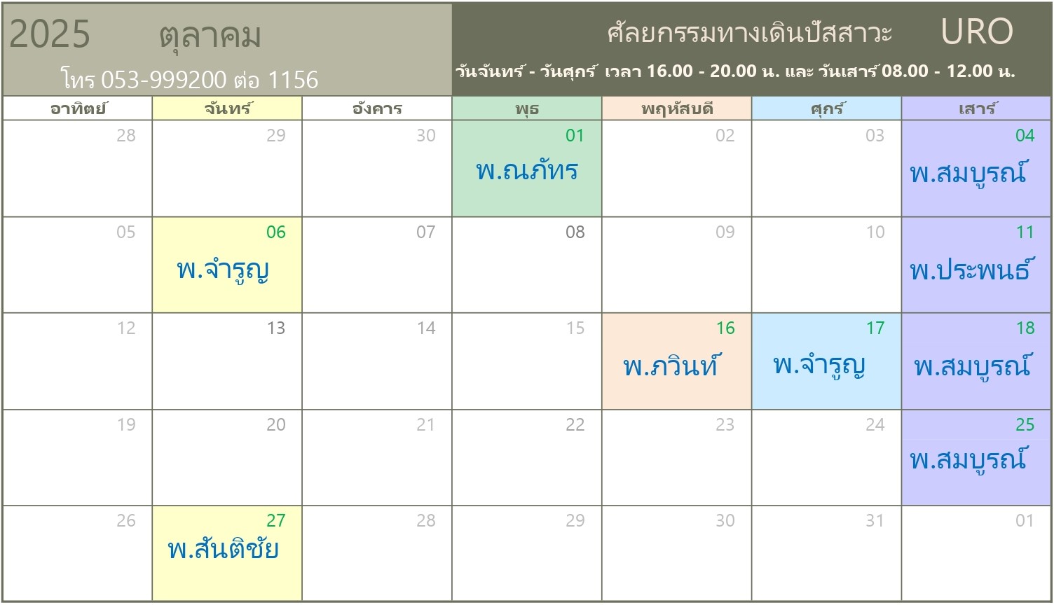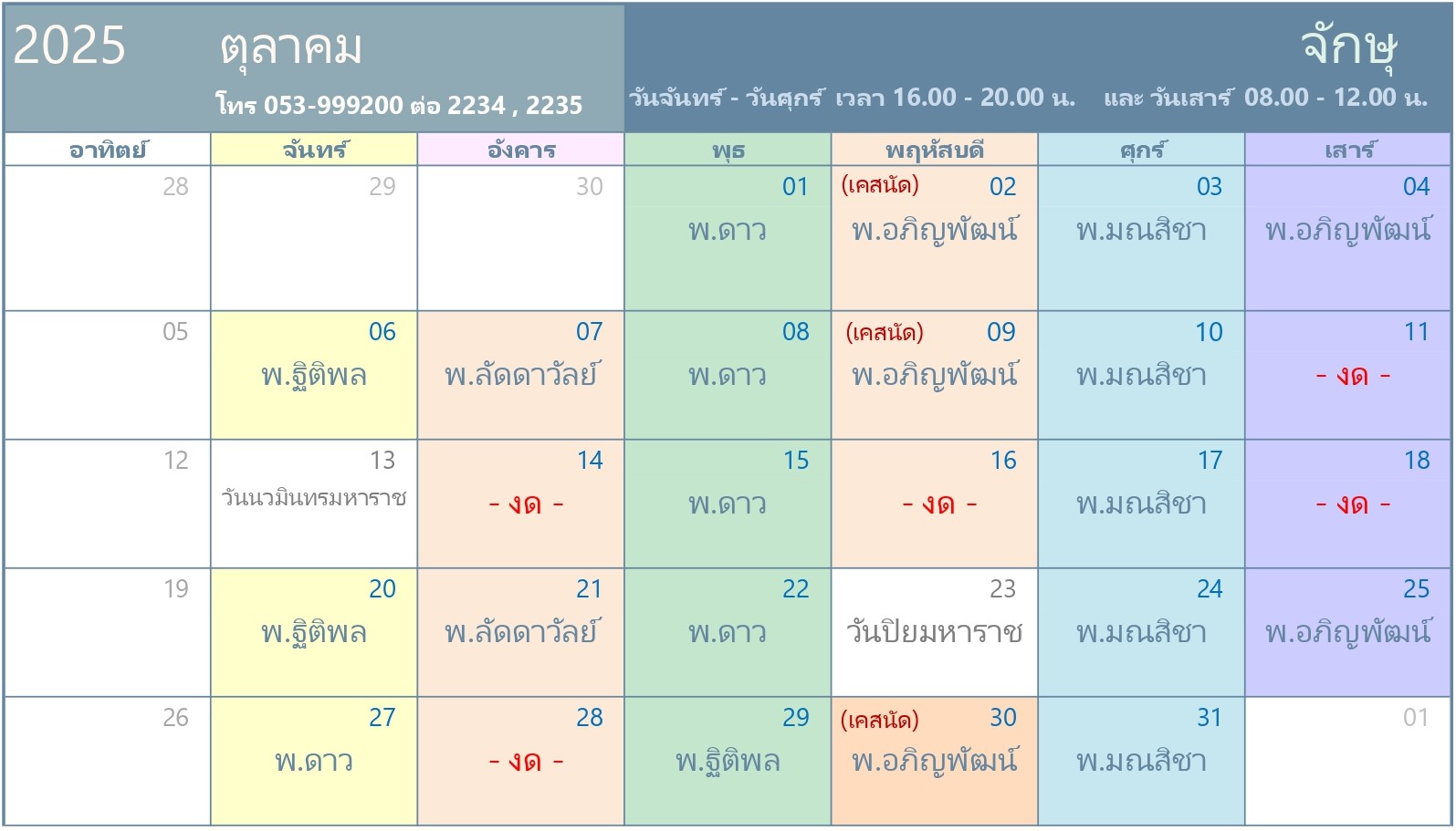 พฤหัสบดี (2,4) | นพ.ขุนเขา ฤกษ์วรชัย | วว.กุมารเวชศาสตร์ , วว.กุมารเวชศาสตร์โรคระบบการหายใจ |