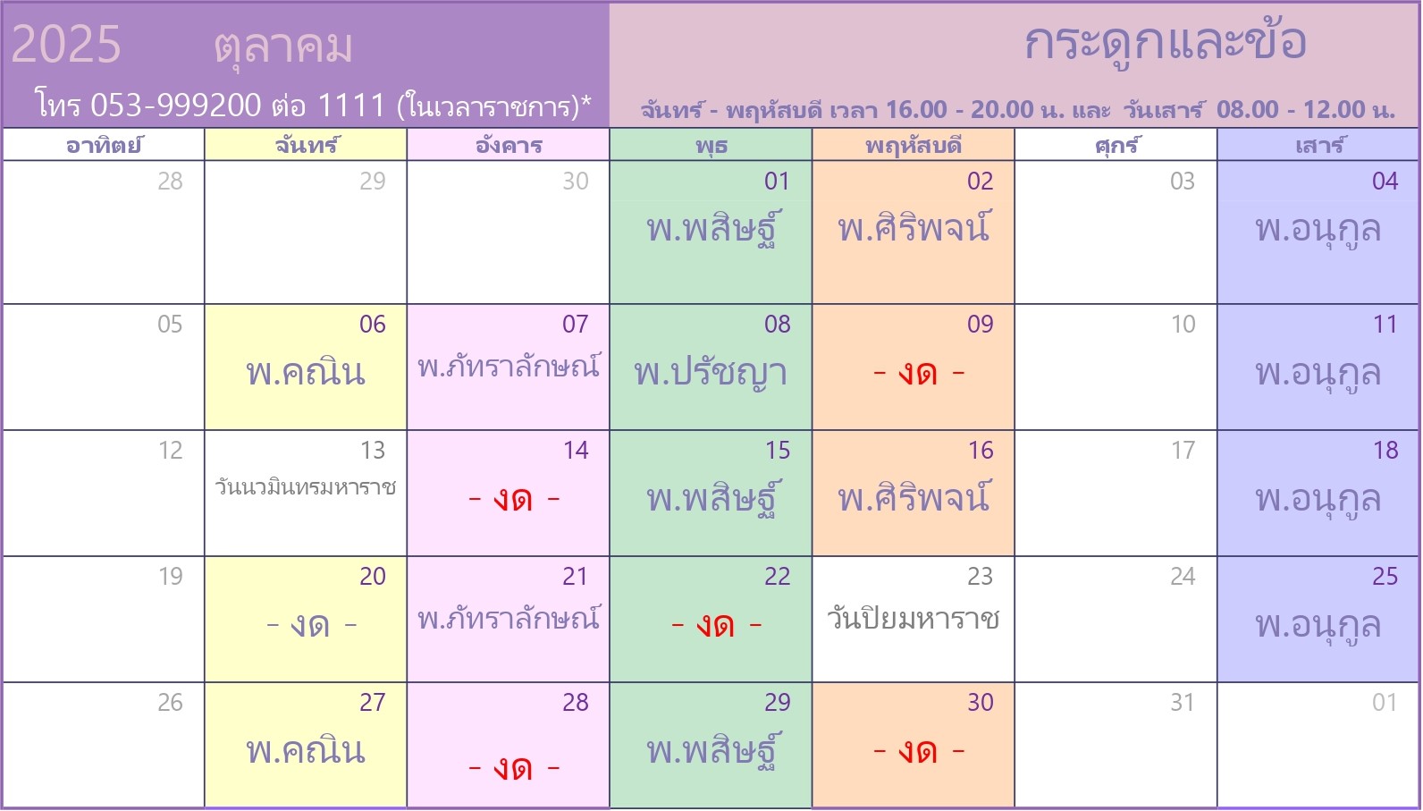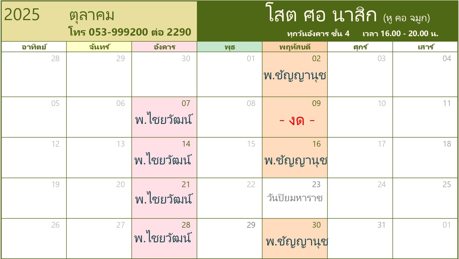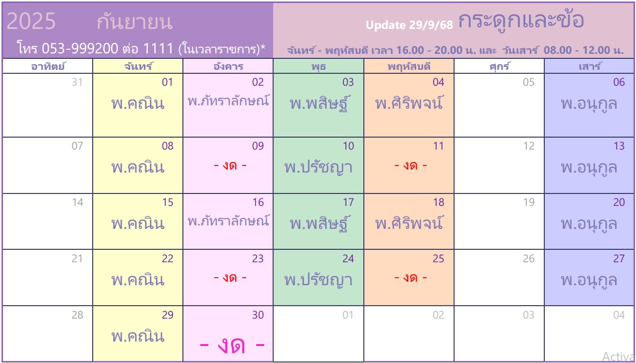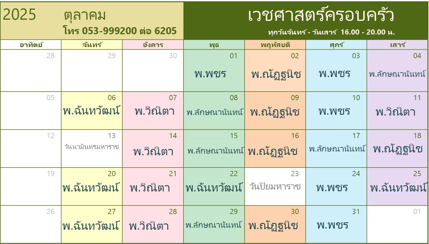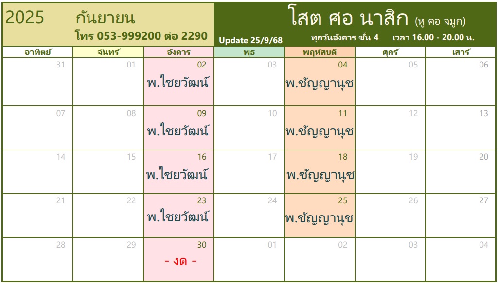 พฤหัสบดี (2,4) | นพ.ขุนเขา ฤกษ์วรชัย | วว.กุมารเวชศาสตร์ , วว.กุมารเวชศาสตร์โรคระบบการหายใจ |