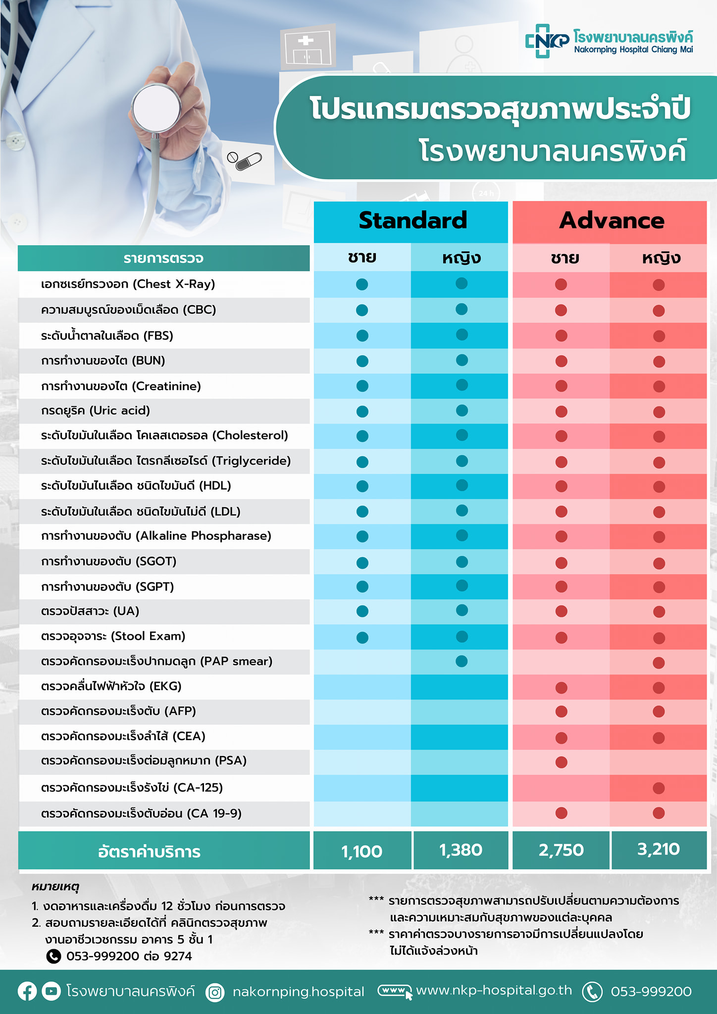1. หากมีข้อสงสัยติดต่อคลินิกตรวจสุขภาพห้องเบอร์ 51 (อาคาร 5 ชั้น 1) กลุ่มงานอาชีวเวชกรรม โรงพยาบาลนครพิงค์ ในวันเวลาราชการวันจันทร์-วันศุกร์ เวลา 08.00-16.00 น. หรือเบอร์โทรศัพท์ 053-999200 ต่อ 9274 หรือ E-mail : nkpoccmed@gmail.com