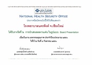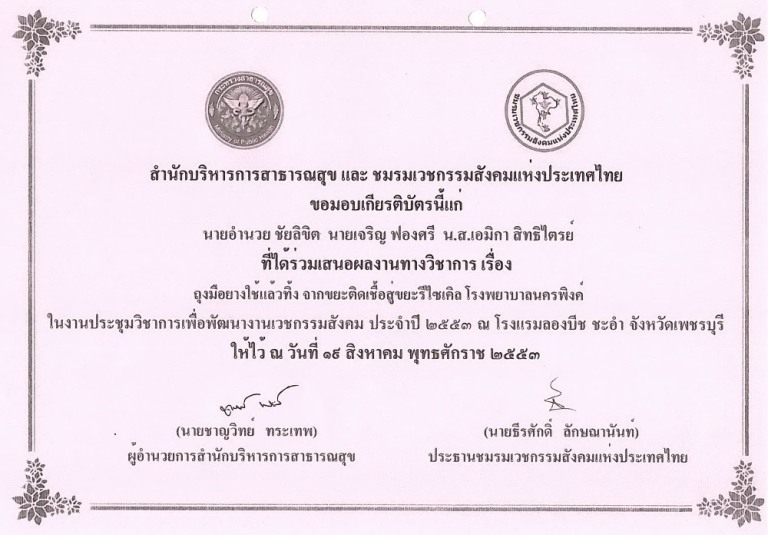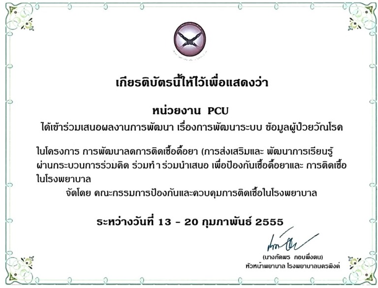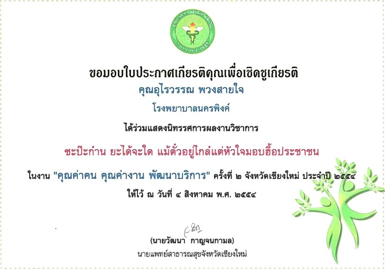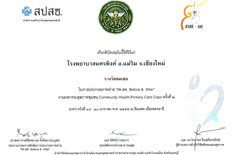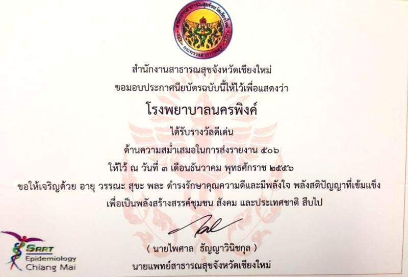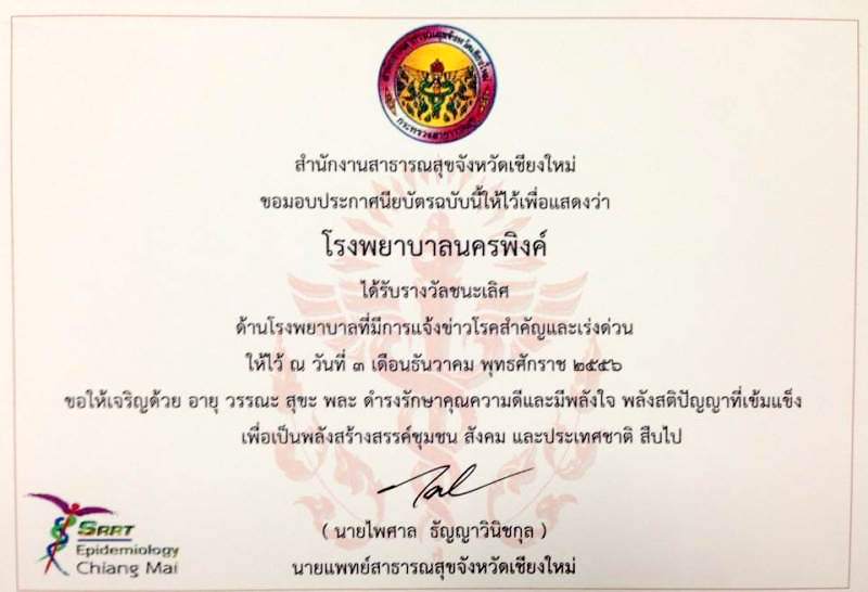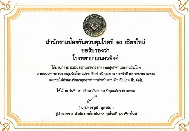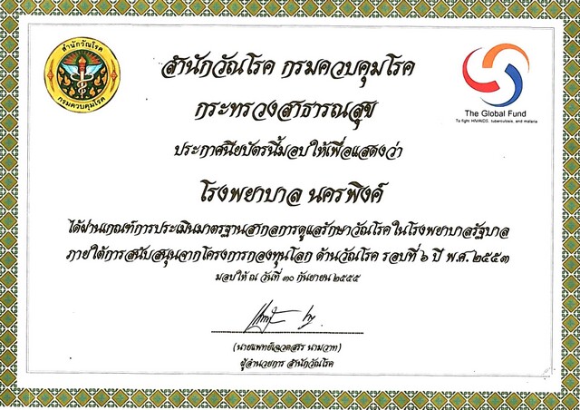 ใบประกาศนียบัตร "รพ.นครพิงค์ผ่านเกณฑ์มาตรฐานสากลการดูแลรักษาวัณโรคใน รพ.รัฐบาลภายใต้การสนับสนุนจากโครงการกองทุนโลกด้านวัณโรค รอบที่ 6 ปี 53 " วันที่ 30 กย.2555 |