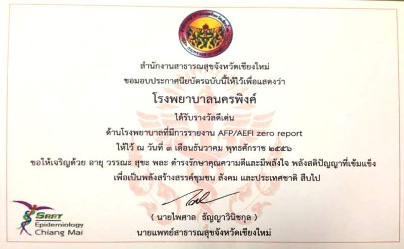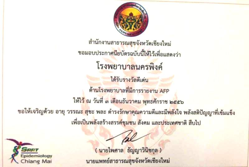 รางวัลดีเด่น ด้านโรงพยาบาลที่มีการรายงานAFP (ตัดสินจากการเฝ้าระวัง สอบสวน การเขียนรายงานโรคและการติดตามผู้ป่วย) |