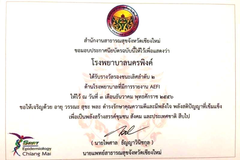 รางวัลรองชนะเลิศลำดับ 2 ด้านโรงพยาบาลที่มีการรายงาน AEFI (ตัดสินจากการ ติดตาม สอบสวนผู้ป่วยที่ได้รับผลกระทบจากวัคซีน) |