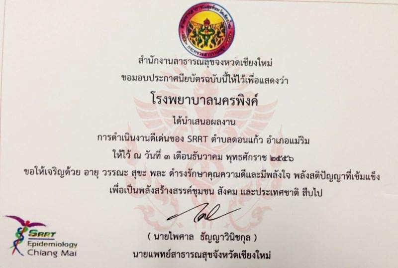 รางวัลการนำเสนอผลงาน ดีเด่นของSRRT ตำบลดอนแก้ว อำเภอแม่ริม (ตัดสินจากการส่งgood practice เข้าประกวด 15 เรื่อง ได้รับรางวัล 4 เรื่อง) |
