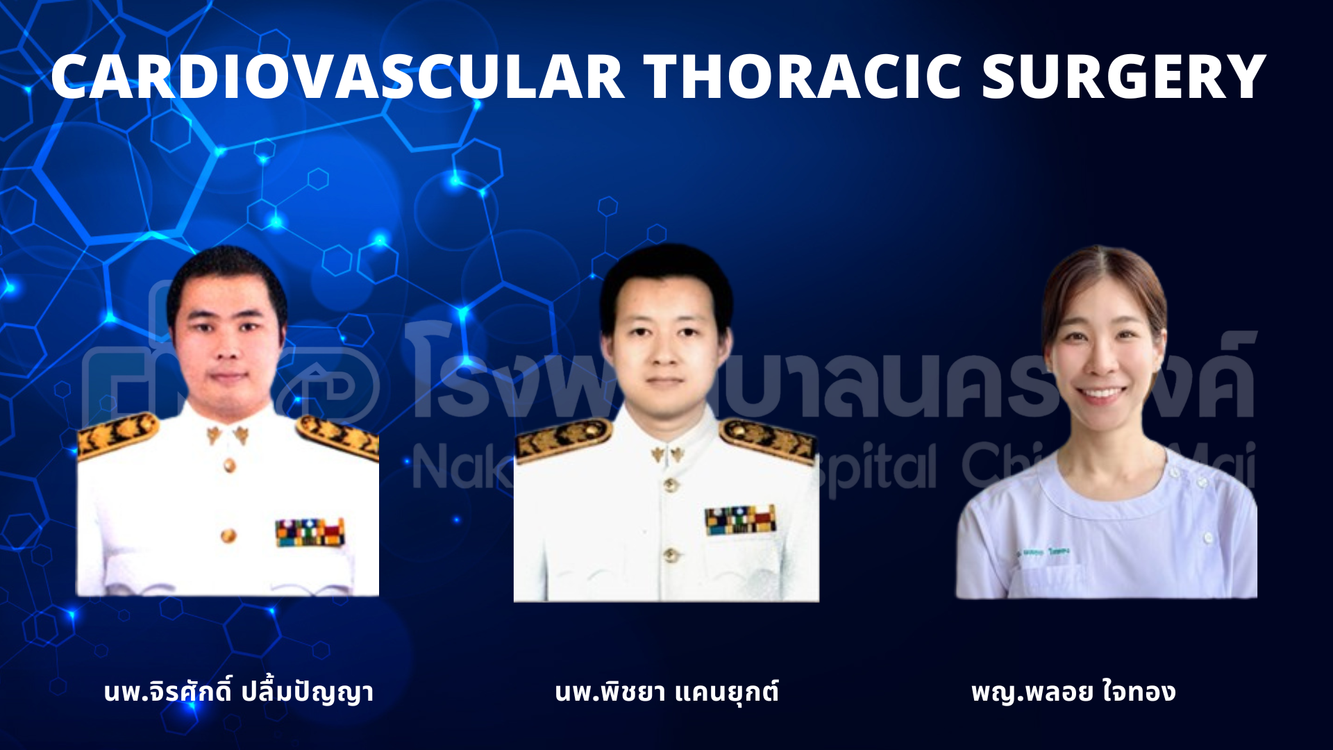 | ศัลยกรรมหัวใจและทรวงอก | นพ.จิรศักดิ์ ปลื้มปัญญา นพ.พิชยา แคนยุกต์ พญ.พลอย ใจทอง |