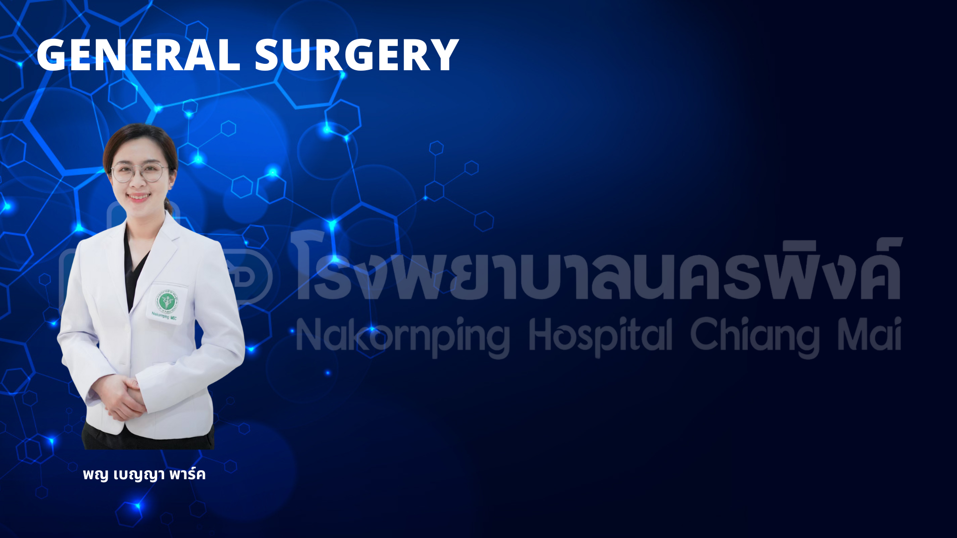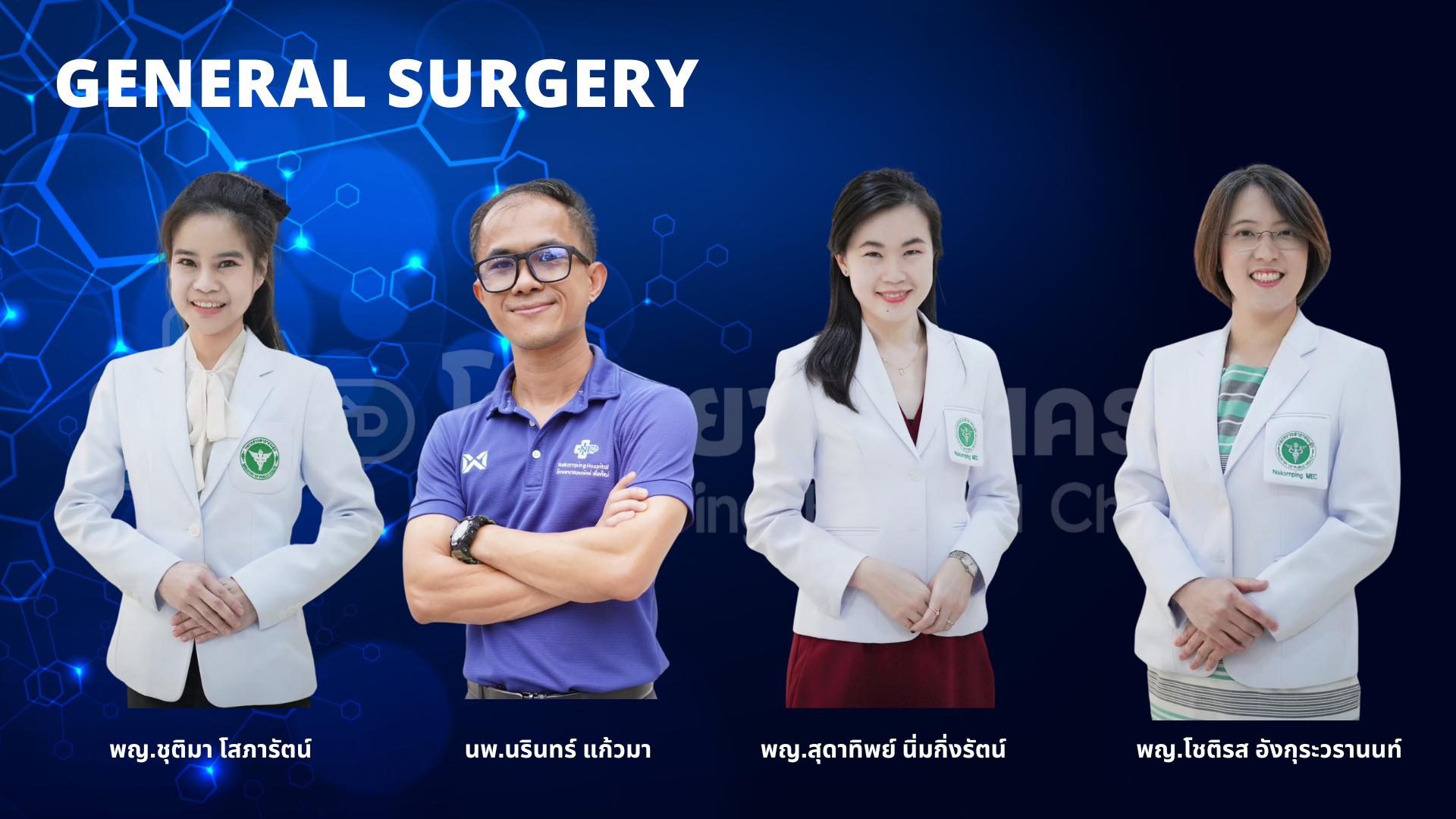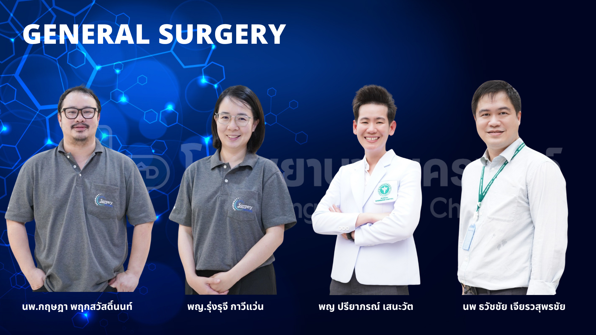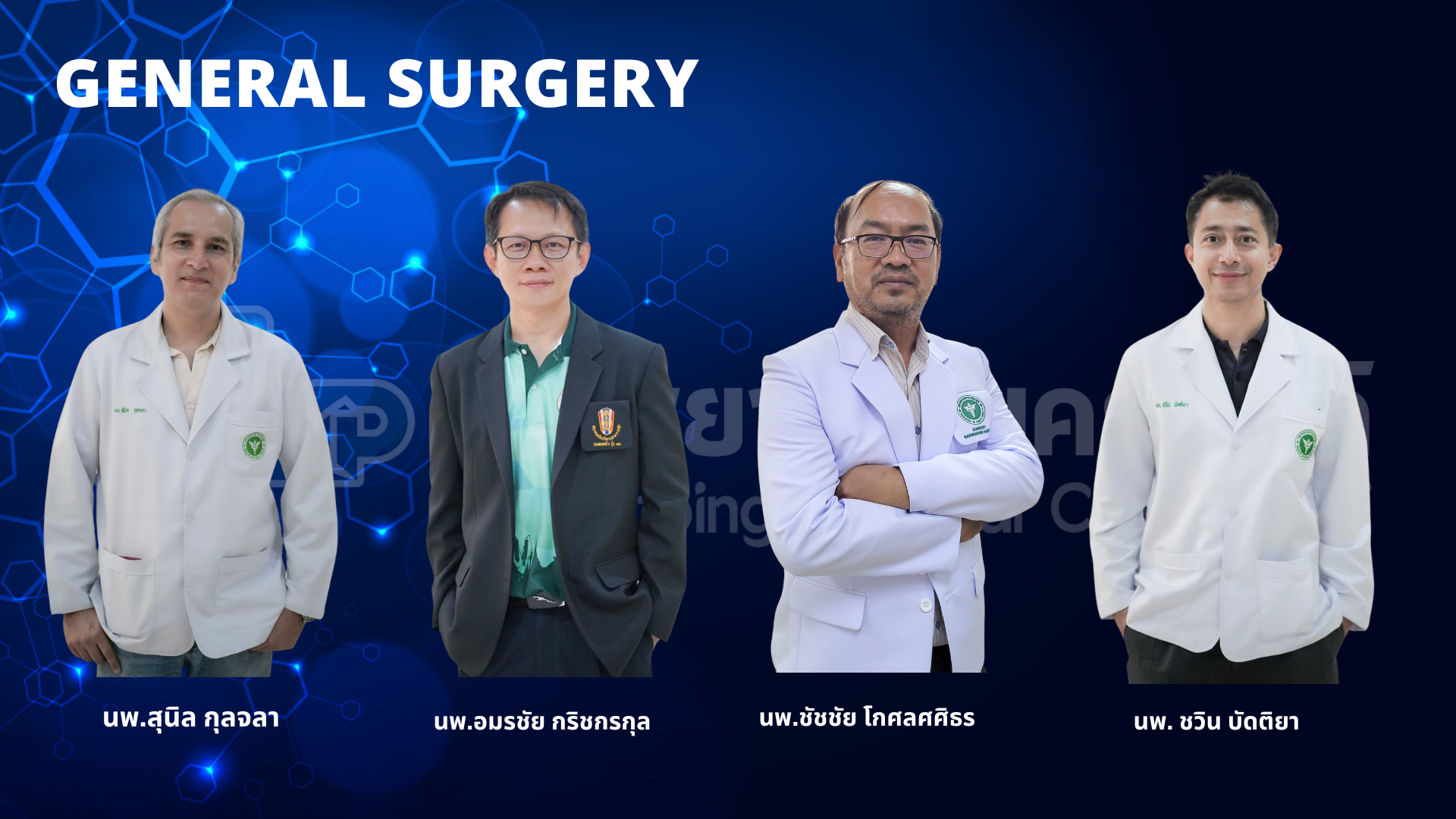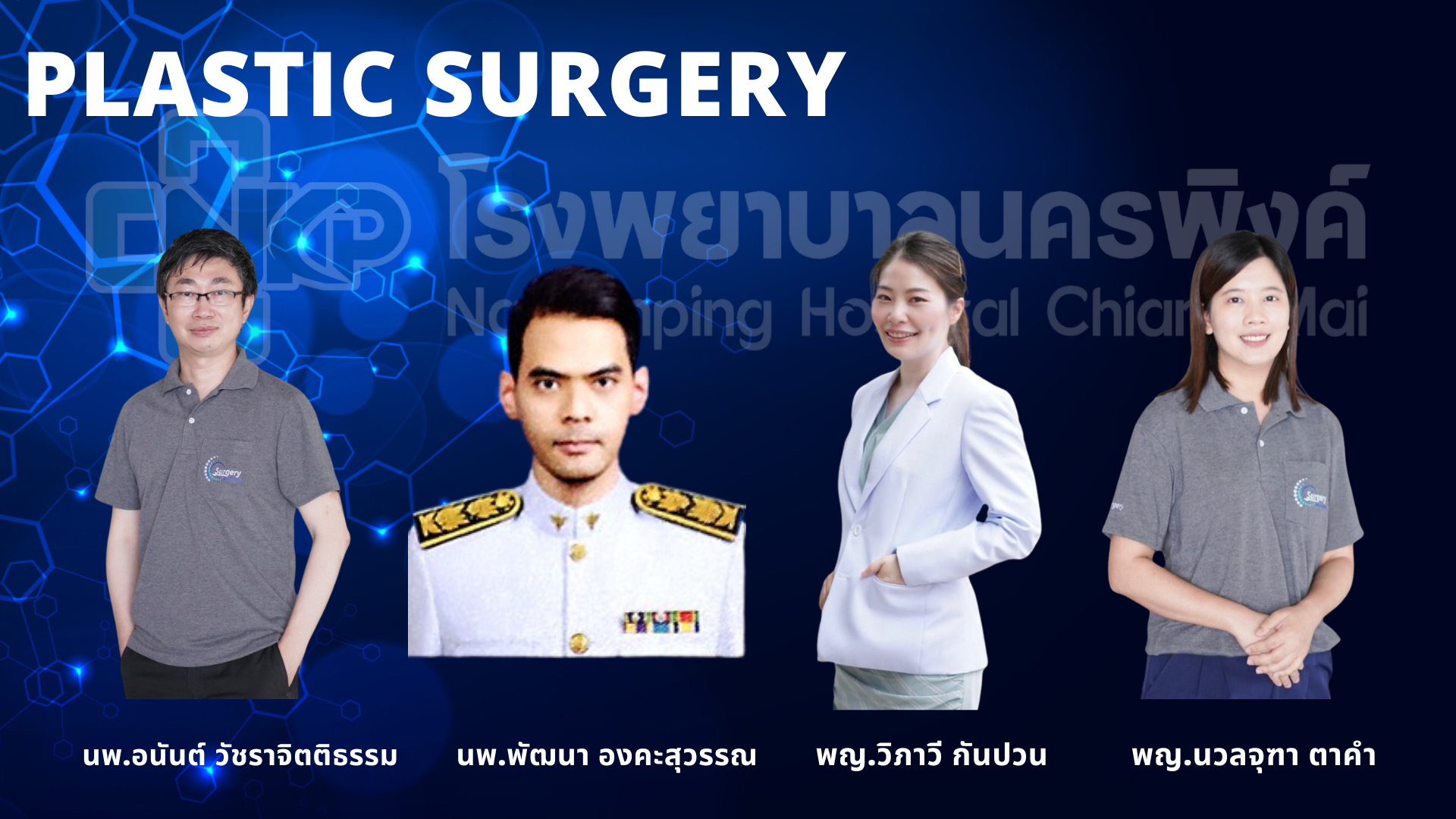 | ศัลยกรรมสร้างเสริมและตกแต่ง | นพ.อนันต์ วัชราจิตติธรรม นพ.พัฒนา องคะสุวรรณ พญ.วิภาวี กันปวน พญ.นวลจุฑา ตาคำ |