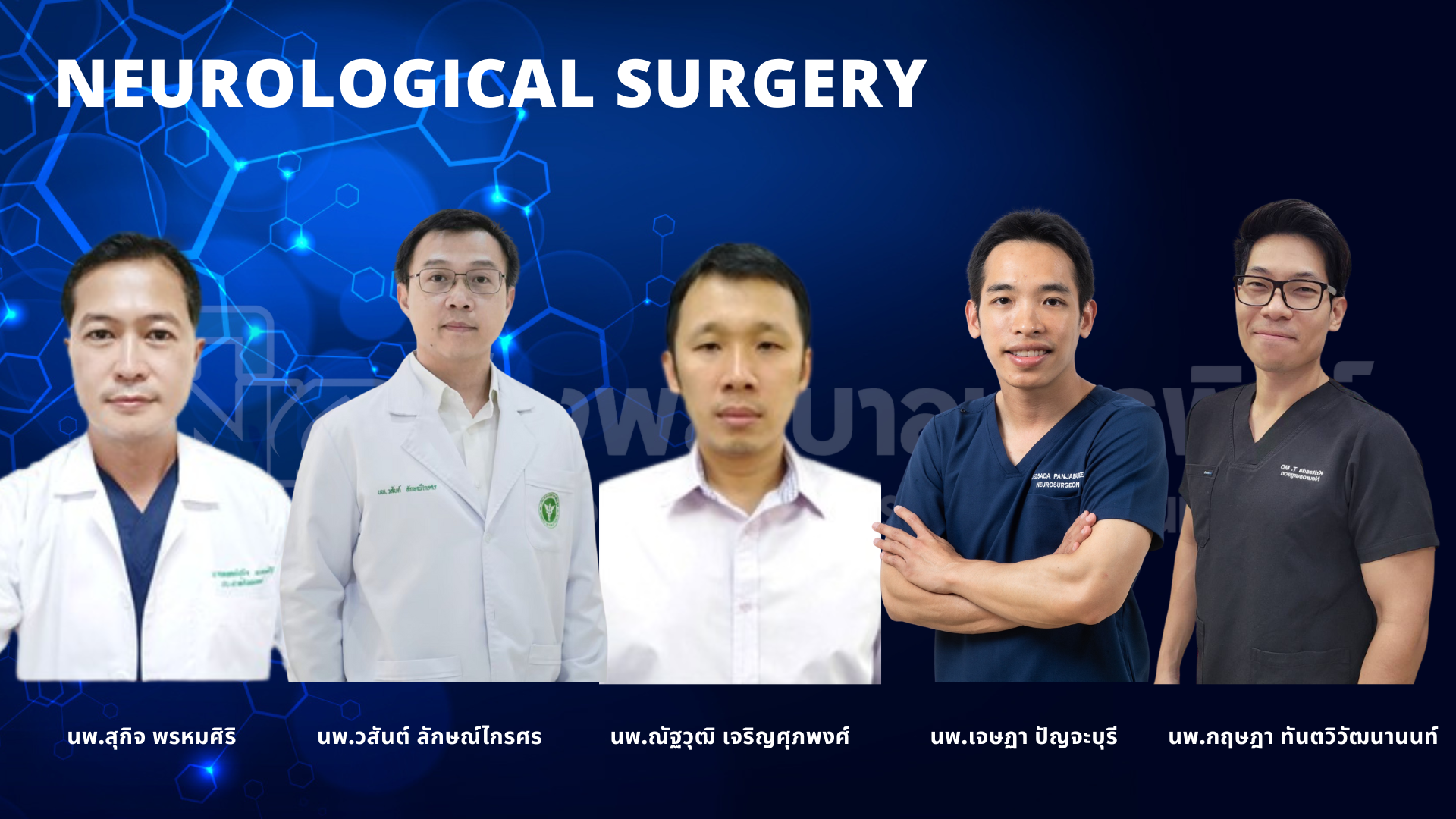| ศัลยกรรมระบบประสาทและสมอง | นพ.สุกิจ พรหมศิริ นพ.วสันต์ ลักษณ์ไกรศร นพ.ณัฐวุฒิ เจริญศุภพงศ์ นพ.เจษฏา ปัญจะบุรี นพ.กฤษฎา ทันตวิวัฒนานนท์ |