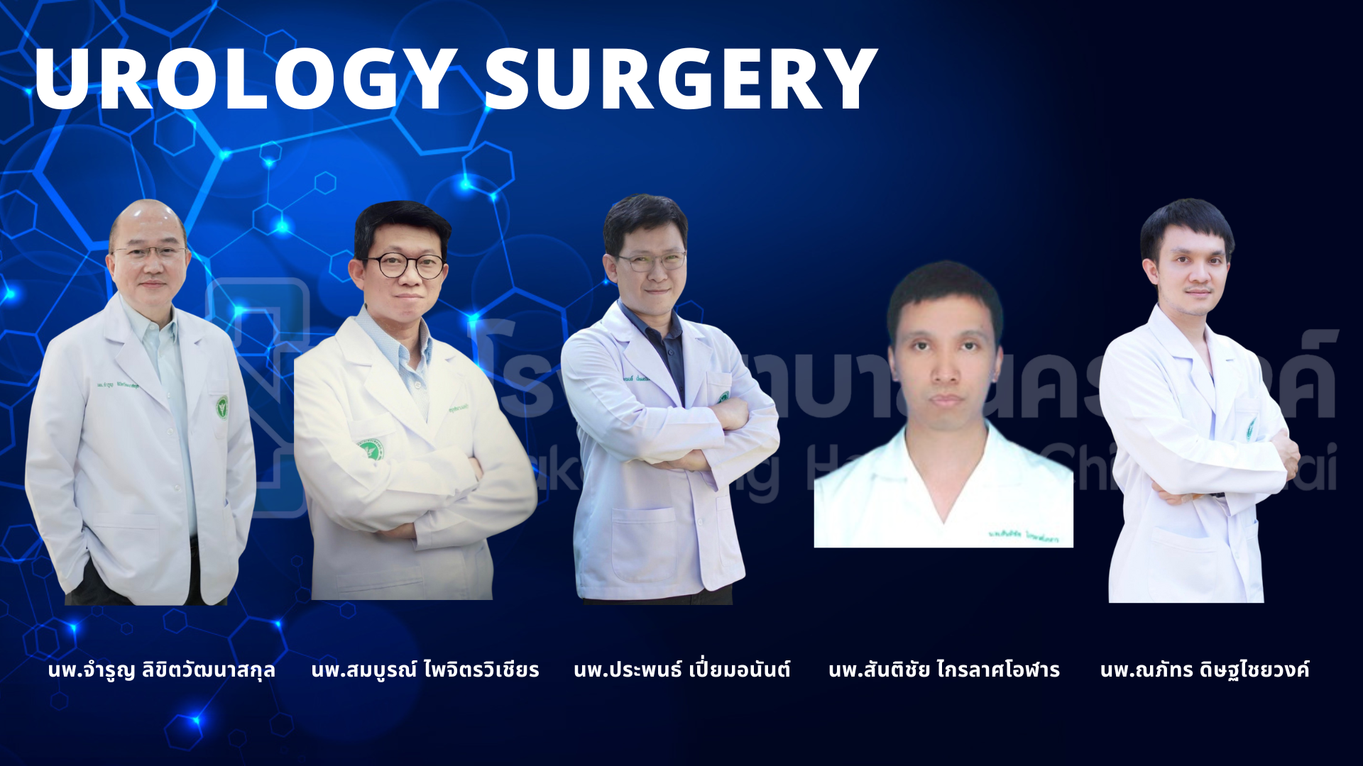 | ศัลยกรรมทางเดินปัสสาวะ | นพ.จำรูญ ลิขิตวัฒนาสกุล นพ.สมบูรณ์ ไพจิตรวิเชียร นพ.ประพนธ์ เปี่ยมอนันต์ นพ.สันติชัย ไกรลาศโอฬาร นพ.ณภัทร ดิษฐไชยวงค์ |